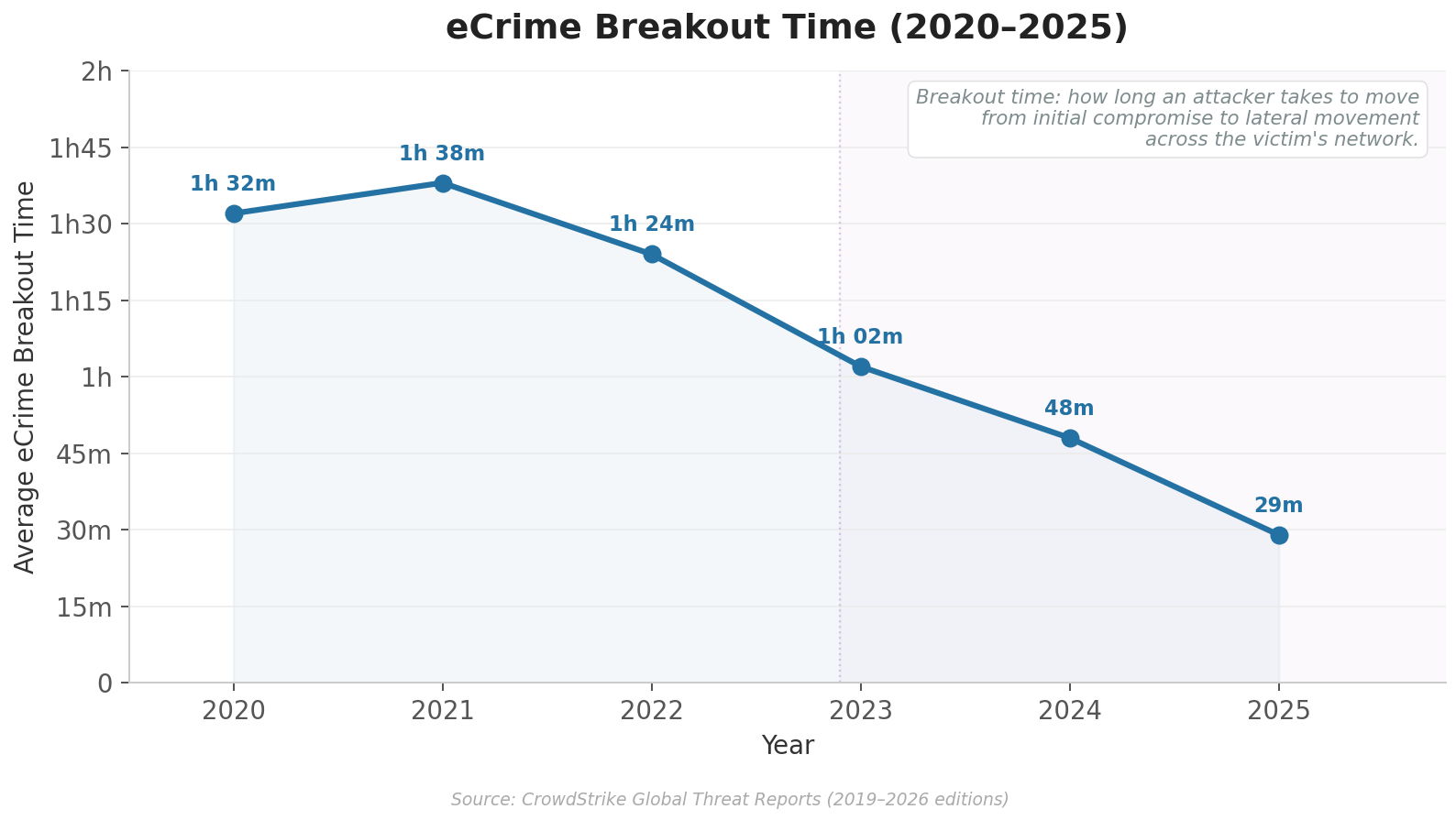 Speed: The time between initial access and full compromise is collapsing. CrowdStrike's 2026 Global Threat Report recorded the fastest eCrime breakout time at 27 seconds, with the average dropping to 29 minutes, which is a 65% increase in speed from 2024. AI will further compress the decision loop between attack steps.